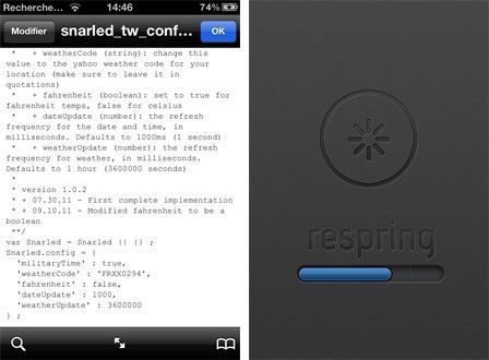 Le widget que vous voyez sur le springboard correspond à l'option BoxiiWidget dans WinterBoard (vous pouvez aussi le désactiver). Pour personnaliser les informations, faites exactement la même chose que pour le LockScreen, mais dans le fichier /var/stash/Themes.xxxxx/BoxiiWidget.theme/ Private/Lib/snarled_tw_config.js, et mettez-y les mêmes informations. Un respring et hop c'est bon ! Si vous voyez sur le widget "Updated at NaN:NaN", c'est normal, ça vient de chez Yahoo et il n'y a rien à faire ...