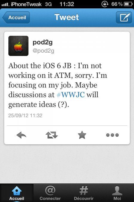 Soit en français : "A propos du Jailbreak d'iOS 6 : Je ne travaille pas dessus désolé. Je suis focalisé sur mon travail. Peut-être que la WWJC me donnera des idées ?"