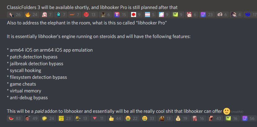 CoolStar, le développeur des jailbreaks Electra, Chimera, Odyssey et dernièrement Taurine, a annoncé hier qu'un plugin payant pour libhooker, appelé libhooker Pro, était en cours de développement. Ce plugin apportera de nouvelles fonctionnalités intéressantes, comme par exemple une obfuscation du jailbreak pour toutes les applications, afin de pouvoir utiliser PokemonGo ou Snapchat sans aucun problème.